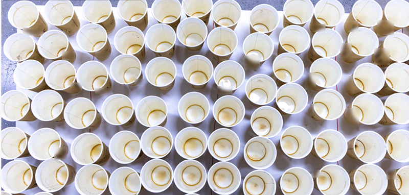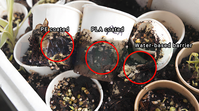 Tar éis 245 lá, bhí an cupán páipéir líneáilte uiscí go hiomlán, díghrádaíodh na snáithíní PLA, an scannán de PLA Hadruptured, agus bhí an scannán PE slán go bunúsach.